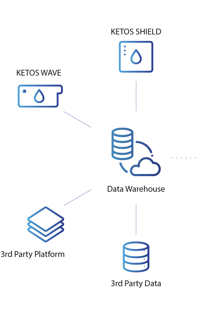 KETOS is not limited to collecting information simply from KETOS sensor systems. Data collected from KETOS sensor systems can be aggregated with publicly available data and existing SCADA system data in a centralized warehouse. These collective datasets can be leveraged to identify and understand issues related to chemical treatment, public health, process control, food processing, effluent discharge compliance, and more.