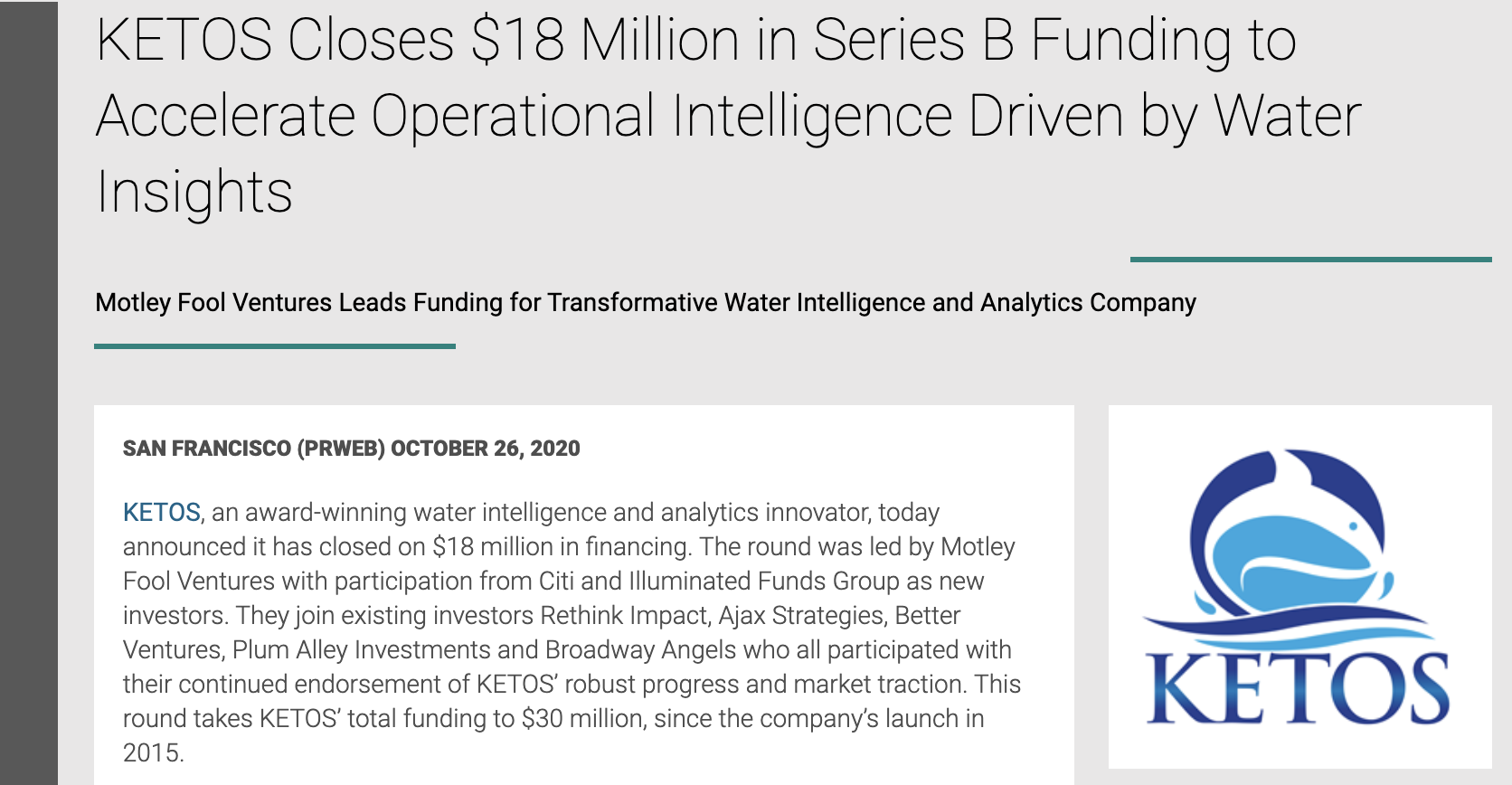 KETOS, an award-winning water intelligence and analytics innovator, today announced it has closed on $18 million in financing. The round was led by Motley Fool Ventures with participation from Citi and Illuminated Funds Group as new investors. They join existing investors Rethink Impact, Ajax Strategies, Better Ventures, Plum Alley Investments and Broadway Angels who all participated with their continued endorsement of KETOS’ robust progress and market traction.